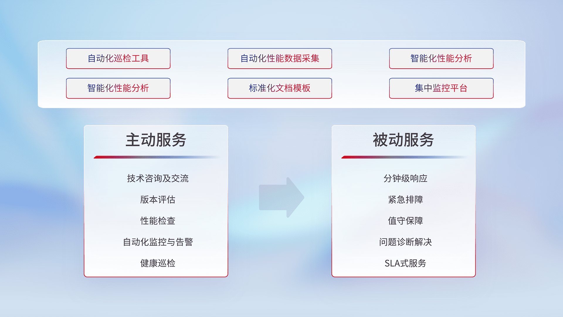 智能化工具和标准化文档,,保障服务质量,,,提供主动服务(包含技术咨询、、版本评估、、、性能检查、、、、自动化监控与告警、、、健康巡检)和被动服务包含(分钟级响应、、、、紧急排障、、值守保障、、、问题诊断解决、、、、SLA服务)。。。